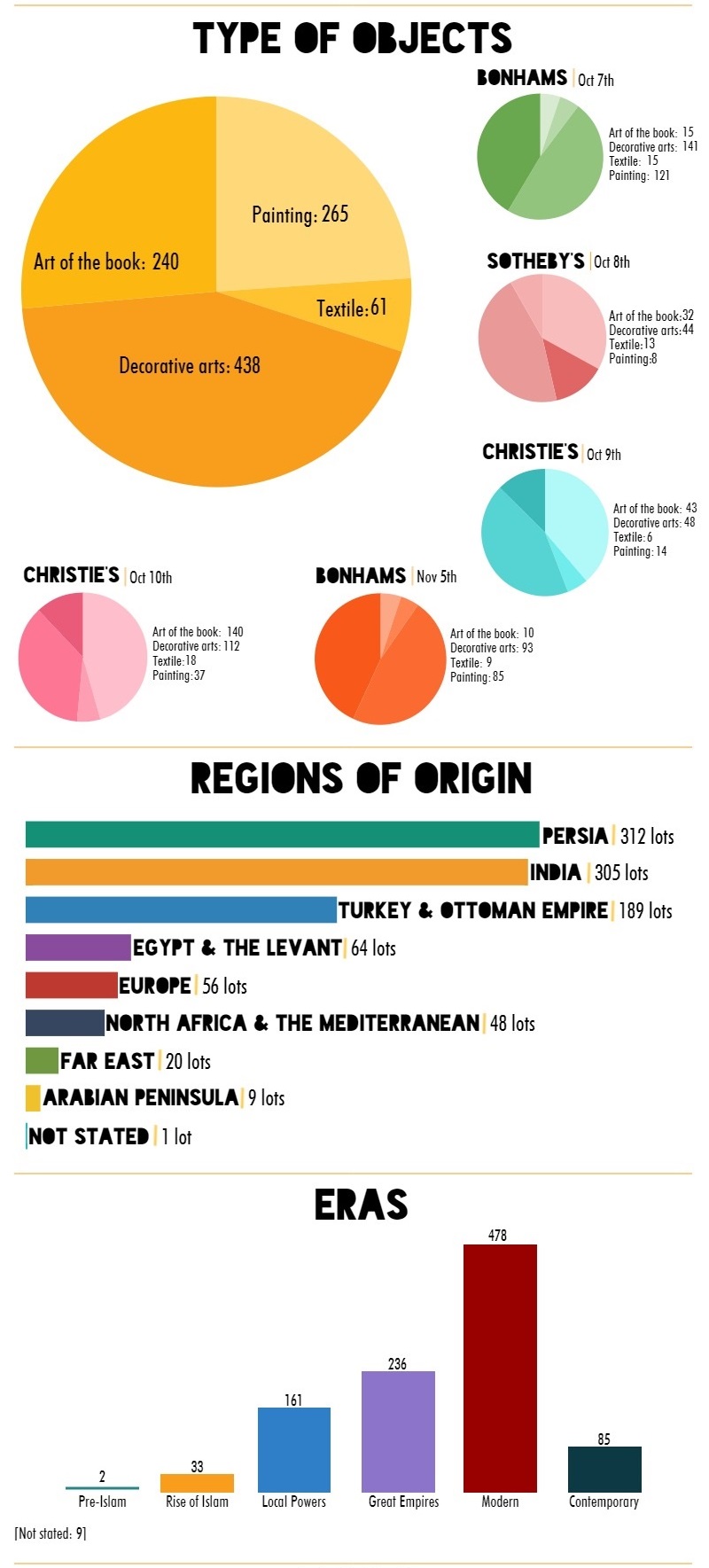 It is clear that the auction market is dominated by objects from the Persian and Indian areas, followed by the Turkish and Ottoman art.