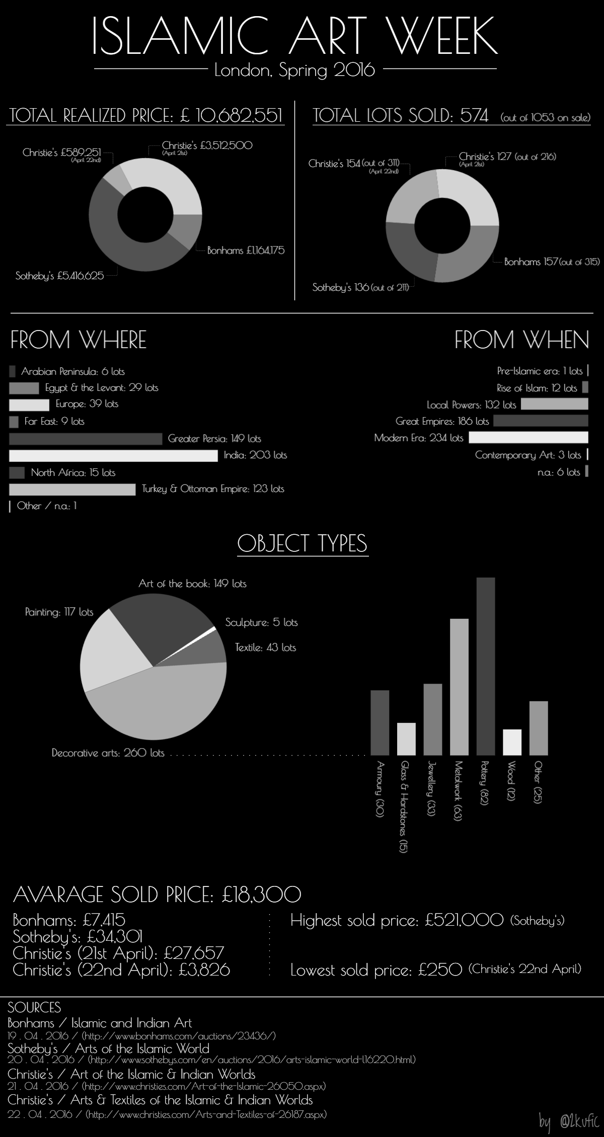 From the chart, it is quite clear, once more, that Islamic art sales used to be better, but it also seems that London Islamic art weeks are slowly recovering, at last. Much needs to be done to get back to the same level the art market reached in Fall 2010 when the four sales raised more that £30 million, but the slight increase registered between Fall 2015 (£10.380.589) and Spring 2016 (£10,682,551) is probably a positive sign.